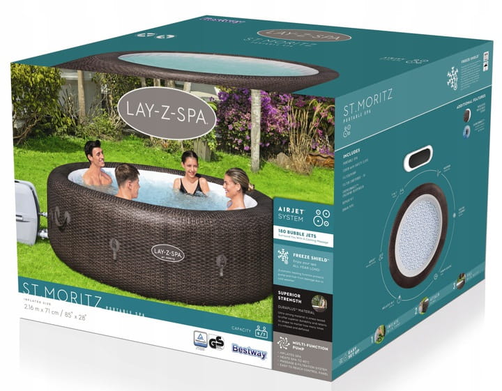 W basenie z masażem Lay-Z-Spa St. Moritz AirJet firmy Bestway przyjemnie może odpocząć aż do 7 osób. SPA jest łatwe w montażu i demontażu, wykonany jest z wytrzymałego materiału DuraPlus™ z modnym, ratanowym nadrukiem. Ściany DuraPlus™ były poddawane specjalnym testom. Aby zapewnić użytkownikom wyjątkowo komfortowy masaż, domowe spa wyposażono również w 180 mocnych dysz powietrznych AirJet. Ponadto, basen ma automatyczny system podgrzewania wody, którego włączaniem i wyłączaniem steruje specjalny timer. Zarówno pompa, jak i ogrzewanie basenu, są wyposażone w wyłącznik przeciwporażeniowy (220 V/2,050 W) ze względów bezpieczeństwa. Temperaturę wody można ustawić na maksymalnie 40°C.