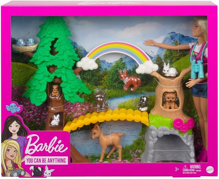 Dziewczynka wyruszy na przygody leśnym szlakiem z zestawem do zabawy Barbie Przewodniczka! Jeśli Twoje dziecko uwielbia zwierzęta, naukę o przyrodzie i wycieczki po lesie, może spróbować swoich sił jako przewodniczka, bo kiedy bawi się Barbie, może być kim chce! W tym zestawie do zabawy znajduje się drzewko, mostek, jaskinia i śliczna tęcza, a także lalka Barbie i aż 10 figurek zwierzątek.