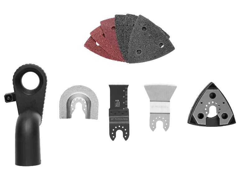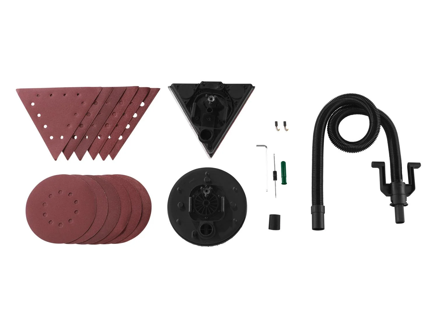 2x zapasowe szczotki węglowe, 2x tarcze szlifierskie (okrągła / trójkątna), 6x arkusze ścierne Ø 225 mm / 6x arkusze ścierne 295 x 295 mm (gradacja 80 / 100 / 120 / 150 / 180 / 240)